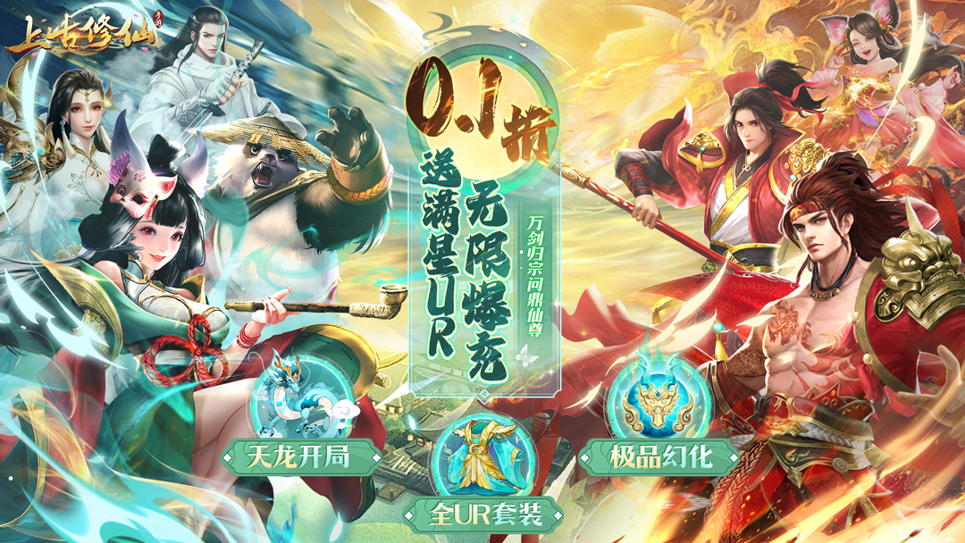 ★真0.1折,无物价上涨,福利送不停!开局天龙,再送648 ★充值比例1:10。在线送免费SSR猫妖。魔神降世,活跃送满星UR伙伴 ★打怪天天掉千元充值卡、各种极品幻化(SSR、SSSR、UR、SP) ★通关主线就送一万连抽+十万仙玉和UR伙伴。全新开箱子玩法,不一样的体验 ★天降神装,任务送全套UR幻化套装 ★登录送超值豪礼(送限定时装,送UR杨戬绝版守护,送限定UR坐骑,送UR小龙女绝版伙伴)