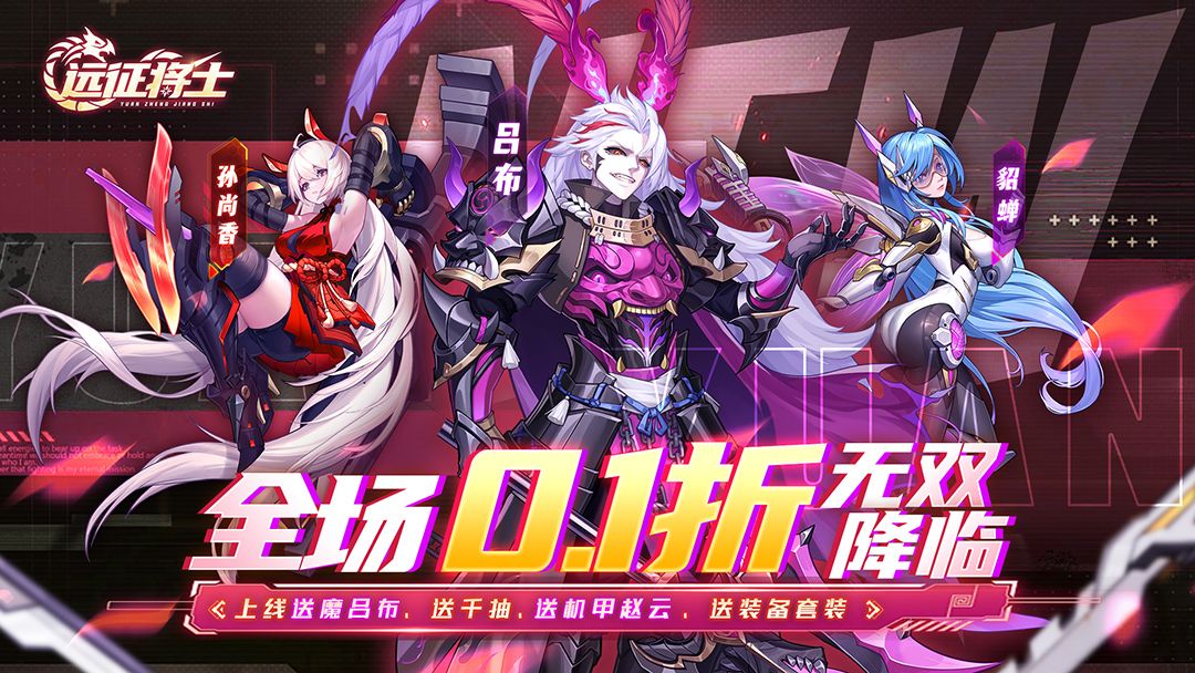 1.首发折扣重磅来袭,全部充值统统0.1折 2.上线送魔·吕布,天选开局,轻松过关 3.上线送千抽 4.提升战力再送奖励,超多抽奖爽到没边 5.累计登录赠送机甲赵云,更有超强神装重磅豪礼等你来领