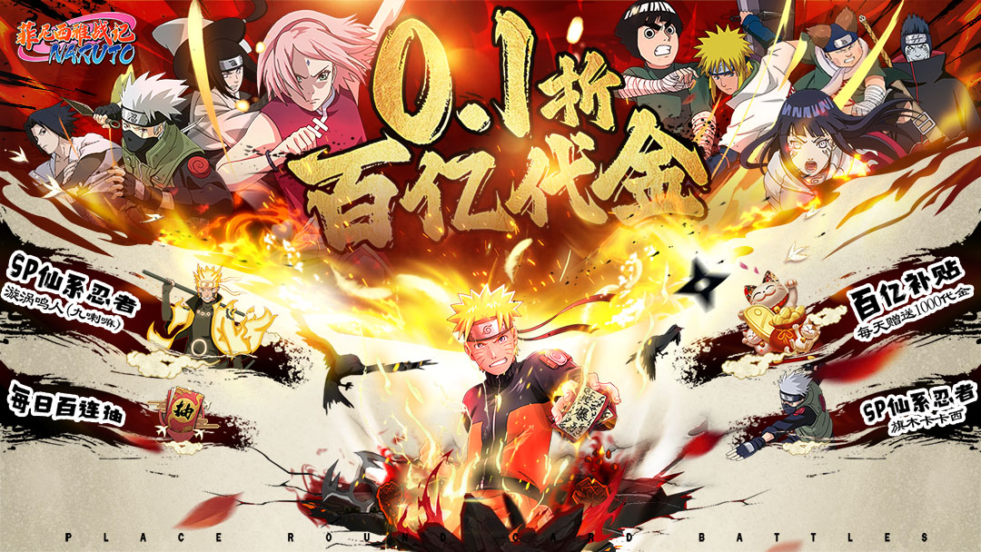 ★【永久0.1折】所有充值0.1折,火影时代悄然降临!! ★【创角福利】开局就送VIP8、SP仙系忍者-漩涡鸣人(九喇嘛),连击斩杀,轻松过关! ★【百亿补贴】全民共享百亿大补贴、每日赠送1000代金!每七天额外目标再送7300代金,免费充值,活动终身循环! ★【八日登录】次日再领SP仙系忍者-旗木卡卡西(须佐能乎);八日登录,SP仙禁忍者三选一,豪礼送不停! ★【签到豪礼】登录即送SP忍者,每日领1000元木叶币,商店道具随便买! ★【在线福利】每日在线免费100连抽,海量忍者抽不停,组建你的传奇忍者小队!